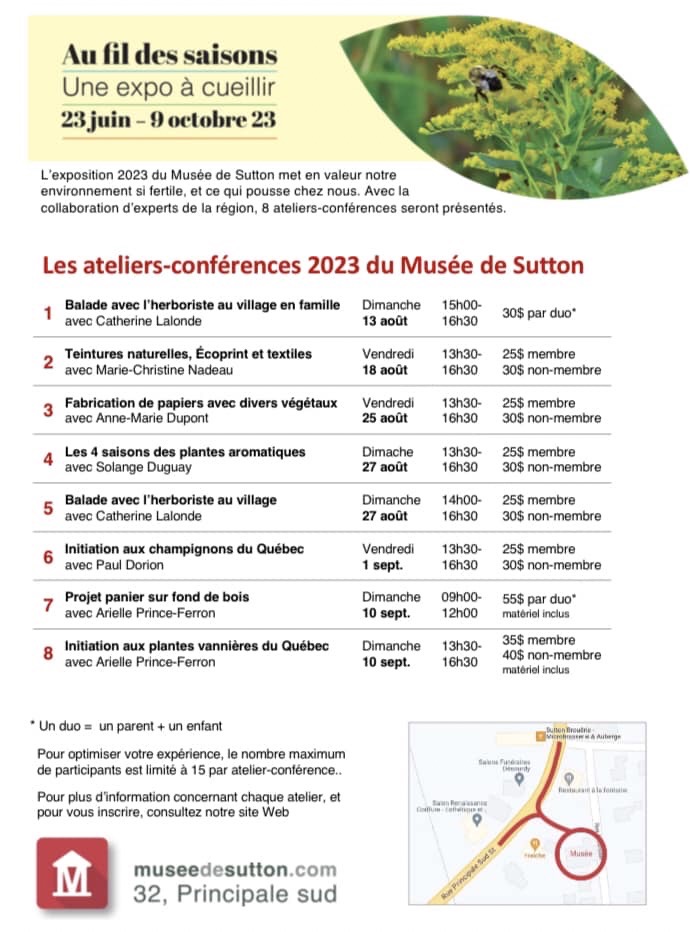 Des ateliers-conférences seront présentés par des experts reconnus de la région : l’horticulture avec Solange Duguay, les teintures naturelles pour tissus avec Marie-Christine Nadeau, les papiers faits à partir de végétaux avec Anne-Marie Dupont et la cueillette des champignons avec Paul Dorion. Un atelier vannerie parents-enfants et un parcours de marche découverte en famille jusqu’au cœur du village de Sutton avec Catherine Lalonde sont également au rendez-vous.